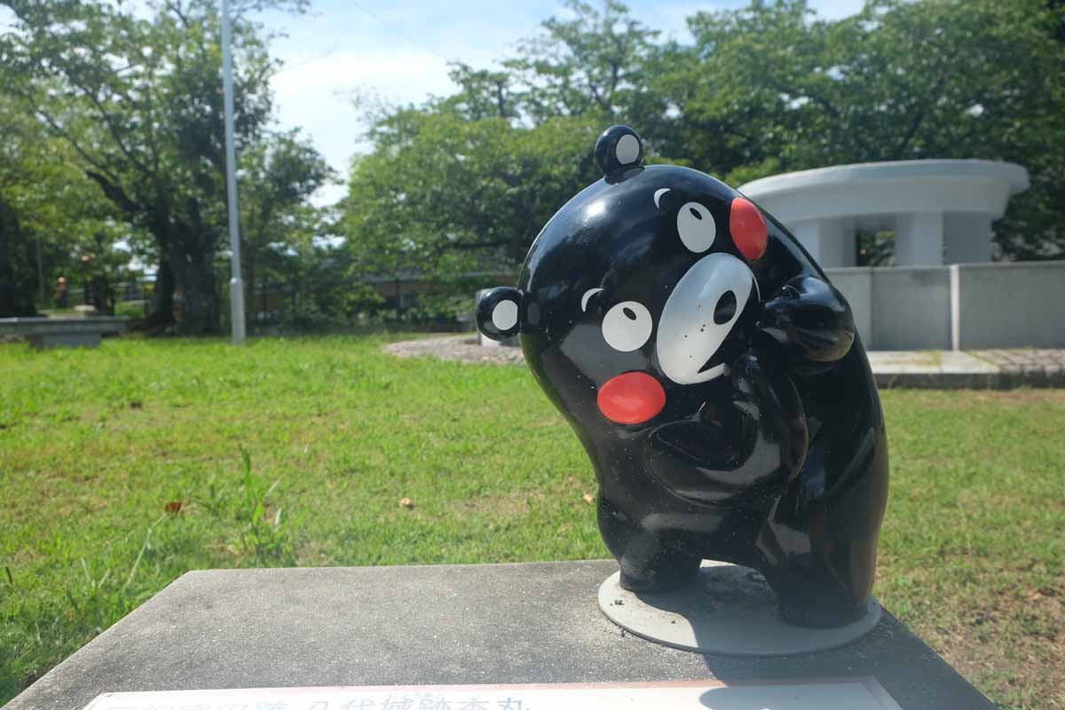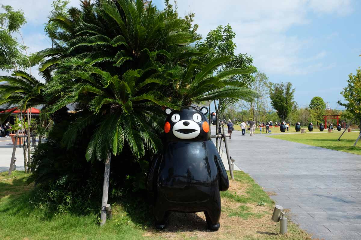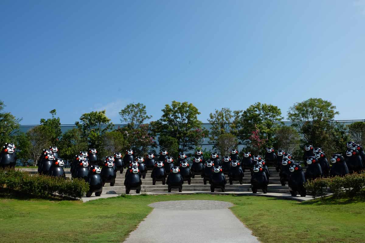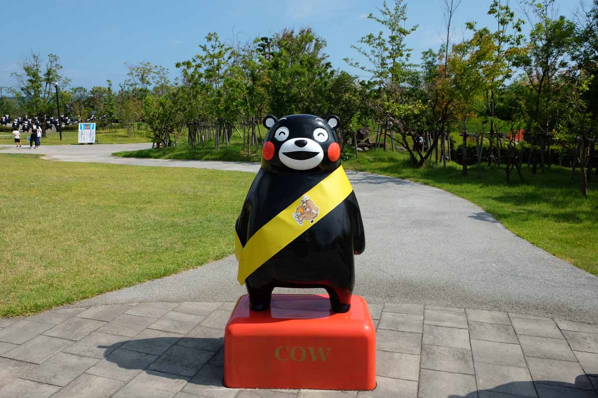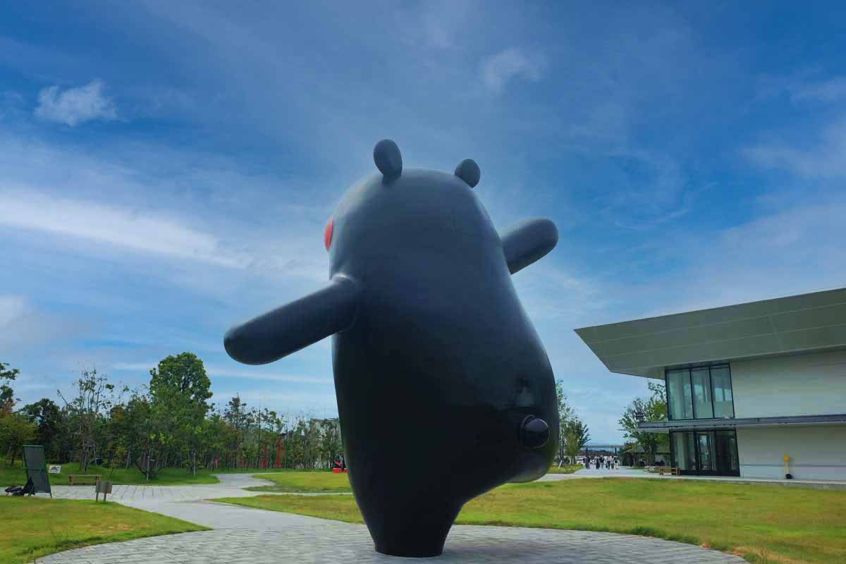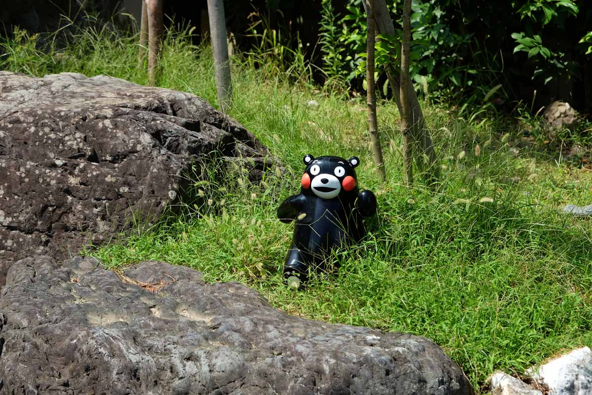 竹林を抜けると、シンボルでもある世界最大のビッグくまモンが。全長6mもの体を片足で支える姿がユニークです。