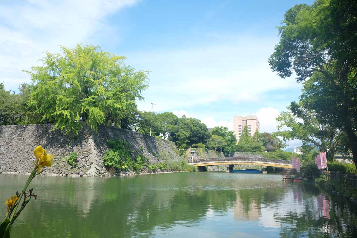 本町アーケードを100mほど進んだら北へ向かい、八代のシンボル「八代城跡」へ。熊本藩主であった加藤忠広の命により元和8年(1622)に築城され、明治維新まで肥後国の一国二城体制(熊本城と八代城)が続きました。明治3年(1870年)に廃城となったため建物は残されていませんが、堀や石垣は当時のものが一部残っています。桜の名所としても親しまれ、2022年には築城400年を迎えました。