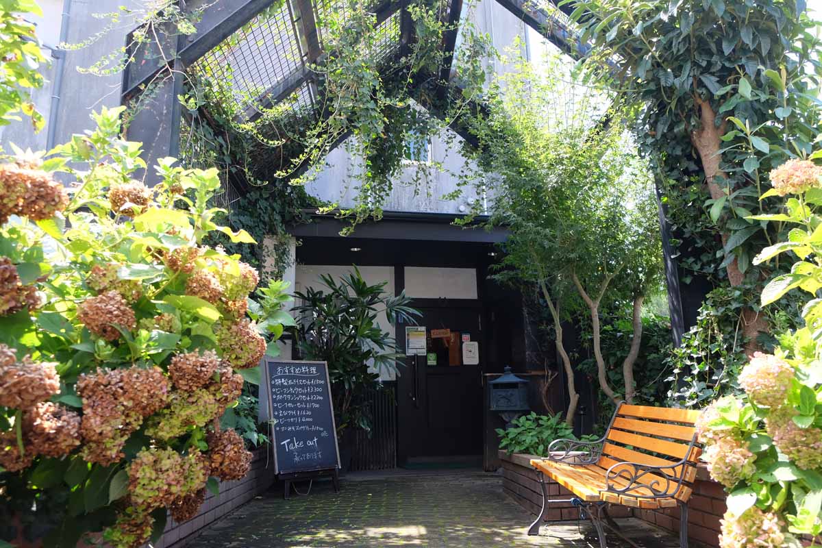 ひと休みを兼ねてランチへ。八代城跡から南東に歩くと、閑静な通りにひっそりとたたずむ一軒家が現れます。「レストラン新木村」は創業30年余り。長く愛される洋食店で、この店の味を求めて県外から訪れる人もいるという名店です。草木や花々に包まれた外観はまるで絵本の世界のよう。