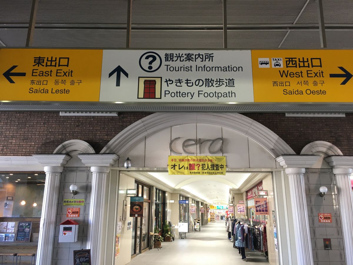 案内に従って駅を出ると、すぐに焼き物でできた猫たちがお出迎えしてくれます。横には「やきもの散歩道」ルートが示された看板があるので、写真を撮影してマップとして活用すると便利かも!