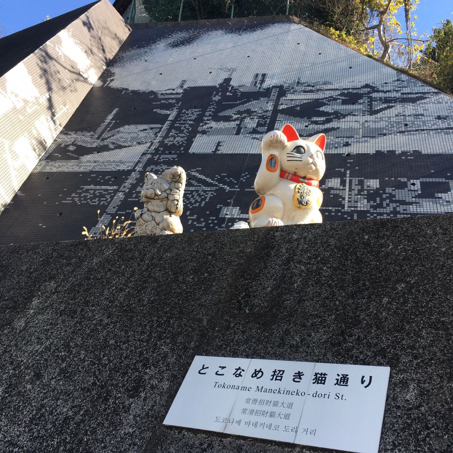 坂を上ると、高さ3.8m、幅6.3mの「とこなめ見守り猫とこにゃん」が、常滑の街を見守ってくれています。右下にいる2匹の猫は近くで見てもとってもリアル。
