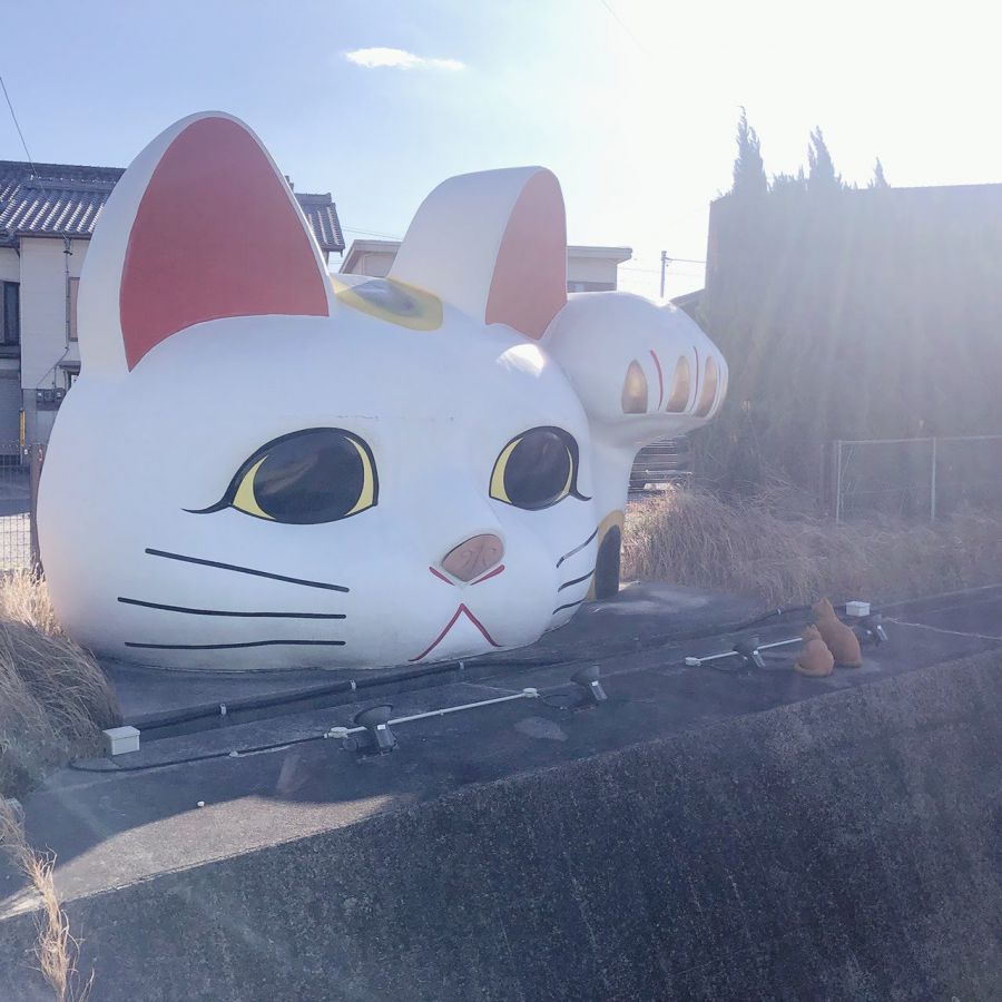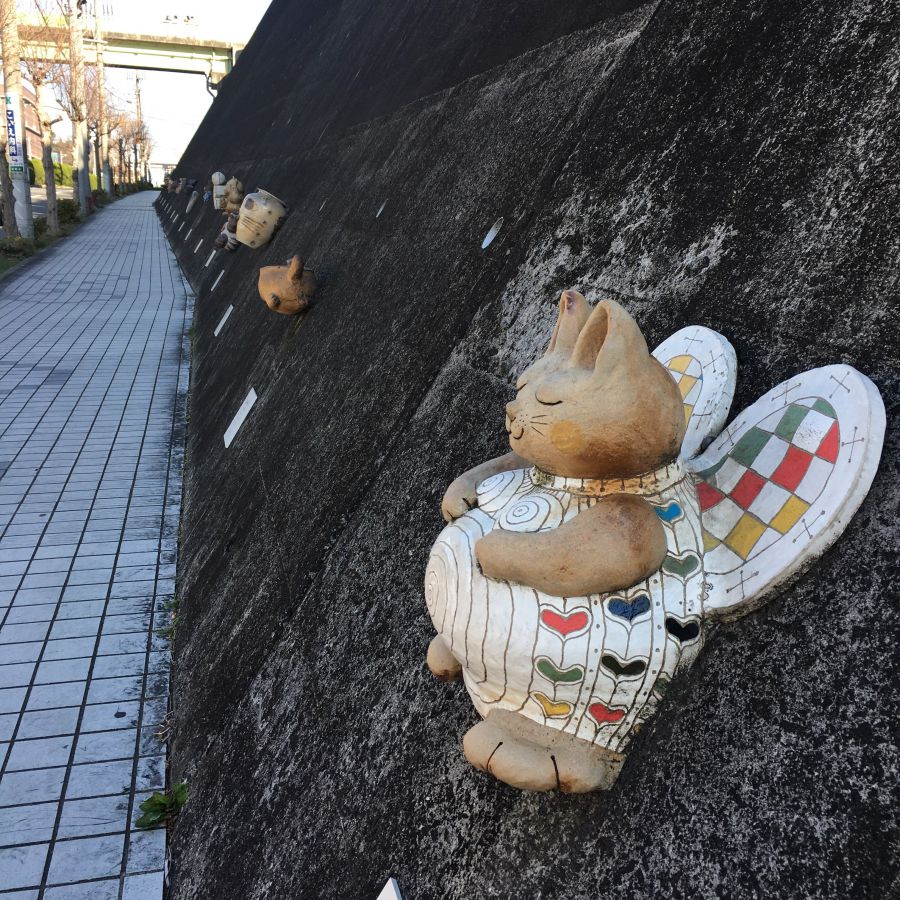 駅から出てまっすぐの道路沿い、コンクリート壁に「巨大招き猫」をはじめ、「御利益陶製招き猫」39体、「本物そっくりの猫」11体がずらり。大きなドット柄が目印です。