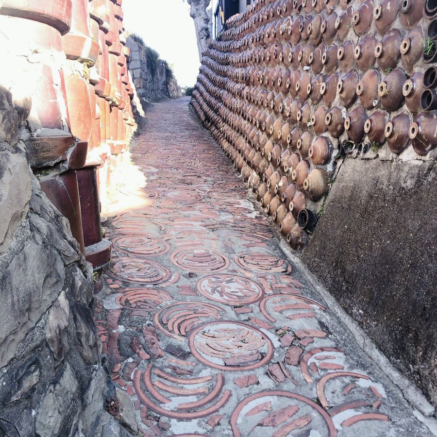 こちらの「土管坂」は、平成2年度の「ふるさとの坂道三十選」に選定されていて、「やきもの散歩道」を代表する風景のひとつ。明治期の土管と、昭和初期の焼酎瓶が左右の壁面をびっしりおおい、「でんでん坂」と同じように地面にも工夫が施されています。