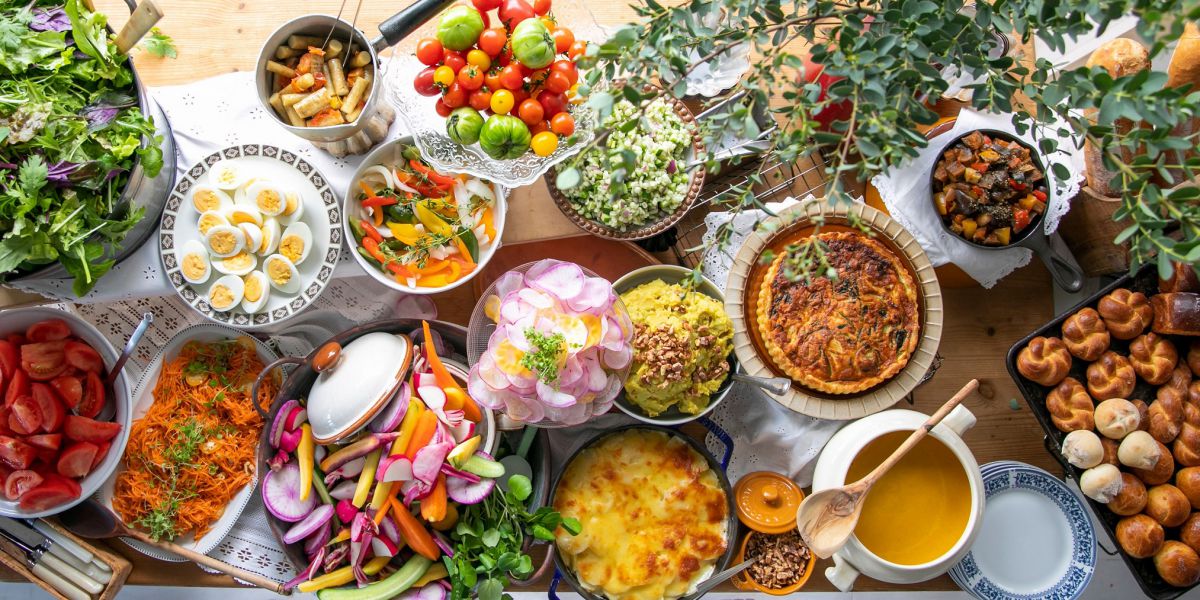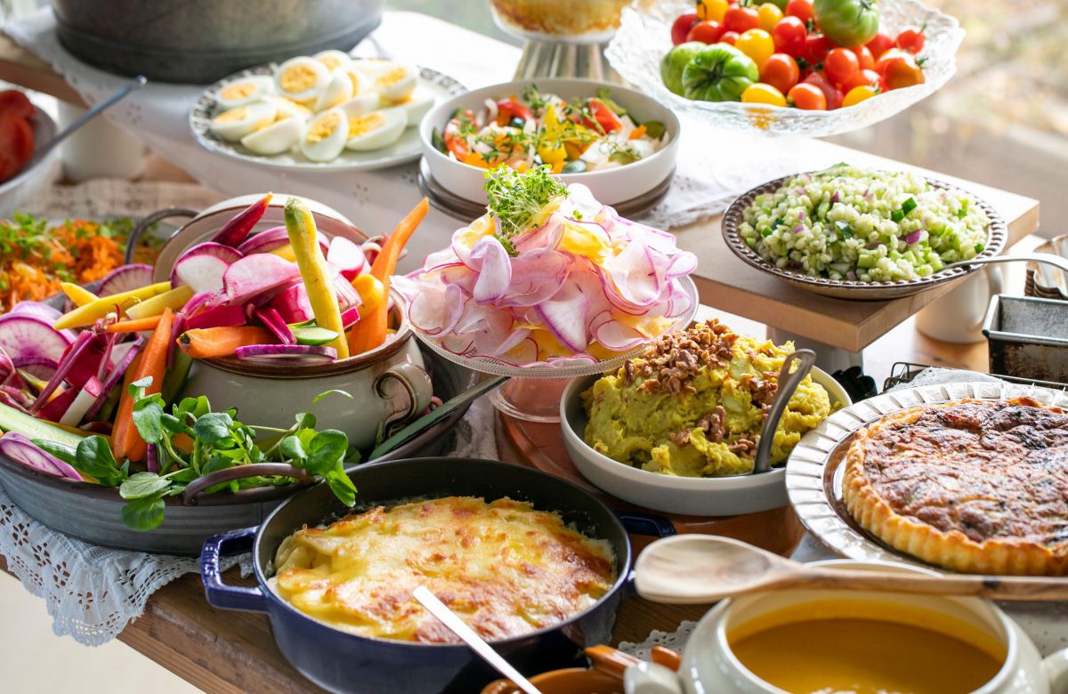 サラダビュッフェには、新鮮サラダ、季節野菜のマリネ、ピクルス、エッグキッシュ、ラタトゥイユ、ジャガイモのグラタン、野菜ポタージュなどバラエティ豊かな野菜料理が並びます。