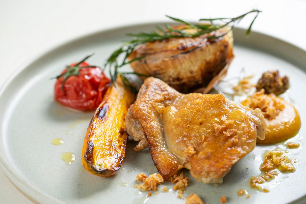 鶏肉とサラダビュッフェ、ポタージュ、パン2つが付いた「チキンローストプレート」1738円。