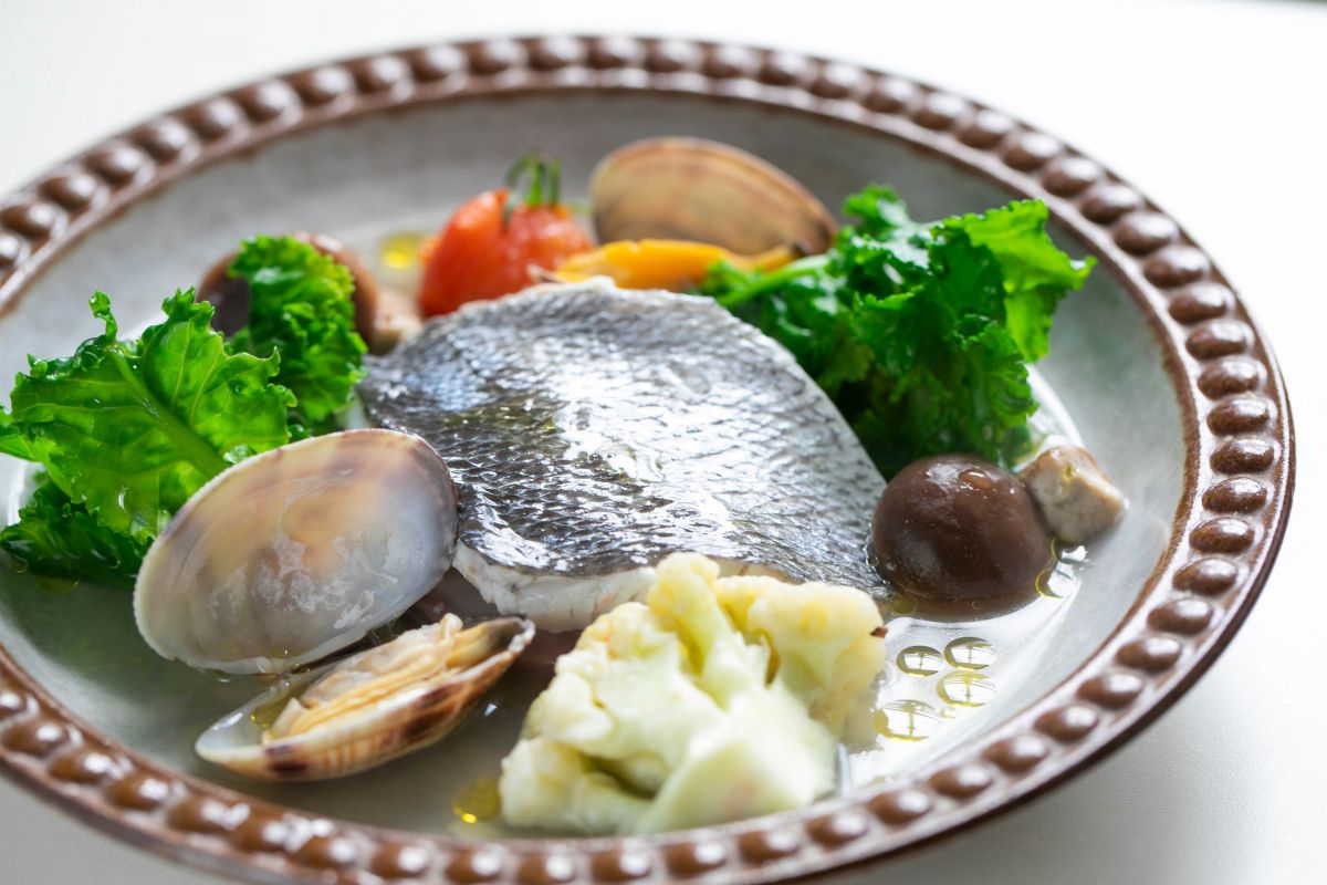 魚の蒸し物とサラダビュッフェ、パン2つがセットになった「スチームフィッシュプレート」1738円。