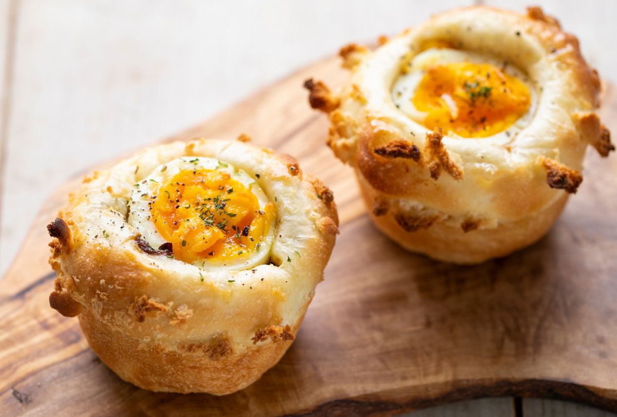 「たまご型メロンパン」151円は、表面はバニラの香り豊かな自家製クッキーでサクッと、中はふんわり。