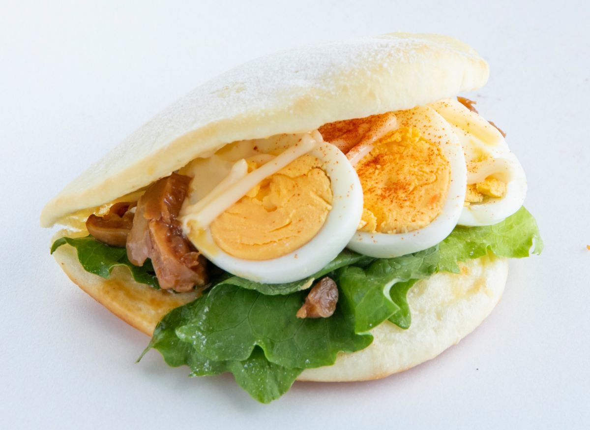 もっちりとしたパン生地に、甘辛の照り焼きチキンと卵をサンドした「照り焼きチキンサンド」410円。