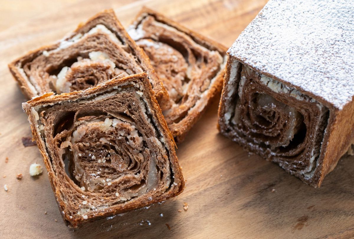 ほろ苦いココア生地に白餡を巻き込み焼き上げた「ココアと白餡のデニッシュ」260円。