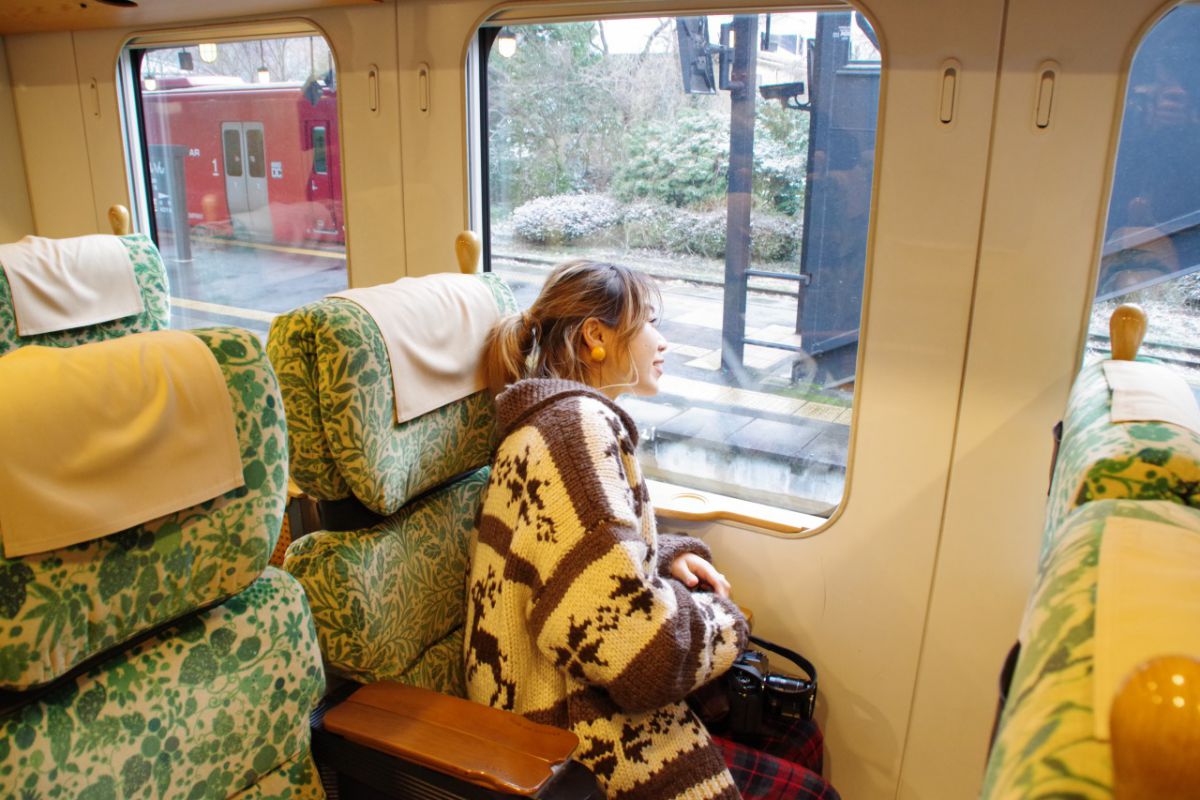 車体や内装のデザインも、ゆふいんのイメージにピッタリなシックで上品な雰囲気。車窓から見える景色も楽しみながらゆふいんを訪れてくださいね。