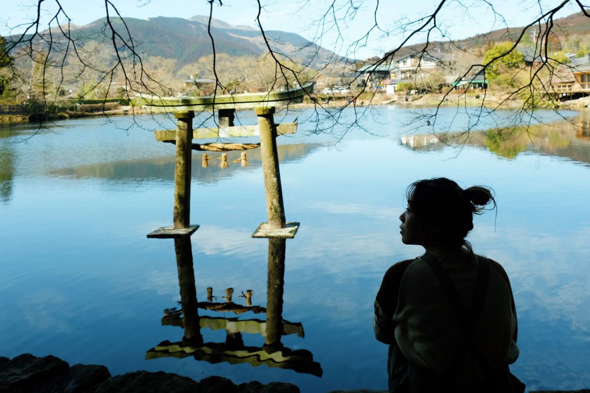 私のおすすめ撮影スポットは、金鱗湖の奥にある天祖神社の周辺。遊歩道をてくてく歩いて、いろんな角度から湖を撮ってみて!