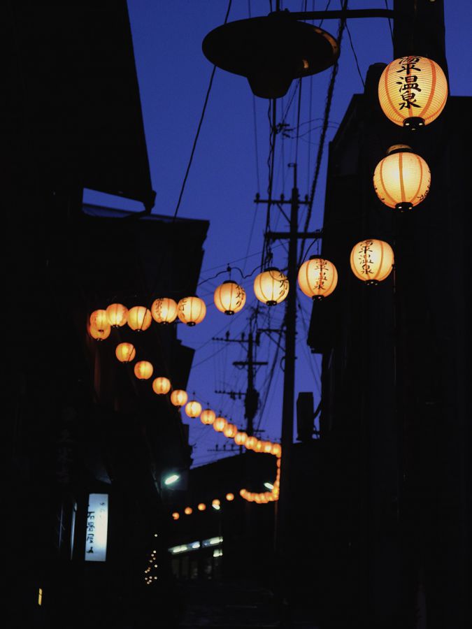 夜になると温泉街に赤い提灯がともり、ノスタルジックな光景が広がります。