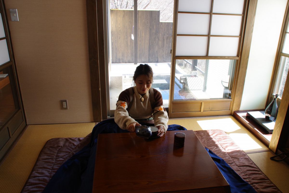 離れの中にはコタツもあり、温泉の流れる音を聞きながら心ゆくまでリラックス。