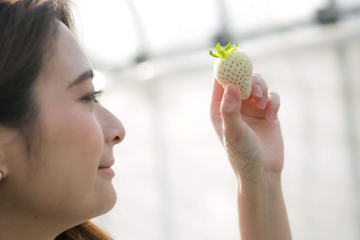 ピンク色の「桃薫」は桃のような芳醇な香りが特徴。栽培が難しく、市場にほとんど出回らないレアな品種。白色の「雪うさぎ」はみずみずしさが特徴で、熟した状態が白。糖度もしっかり高く、非常に美味しいと評判の品種。眺め円錐形が特徴的な「章姫」は、果汁たっぷりでジューシー。30分間の食べ放題で、3つの味を存分に楽しんで!