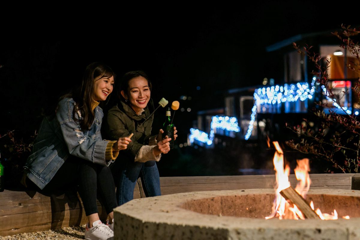 日が沈んだら「焚き火BAR」開店。キャンプファイヤーを囲みながらお酒などのドリンクを楽しむ焚き火BAR。