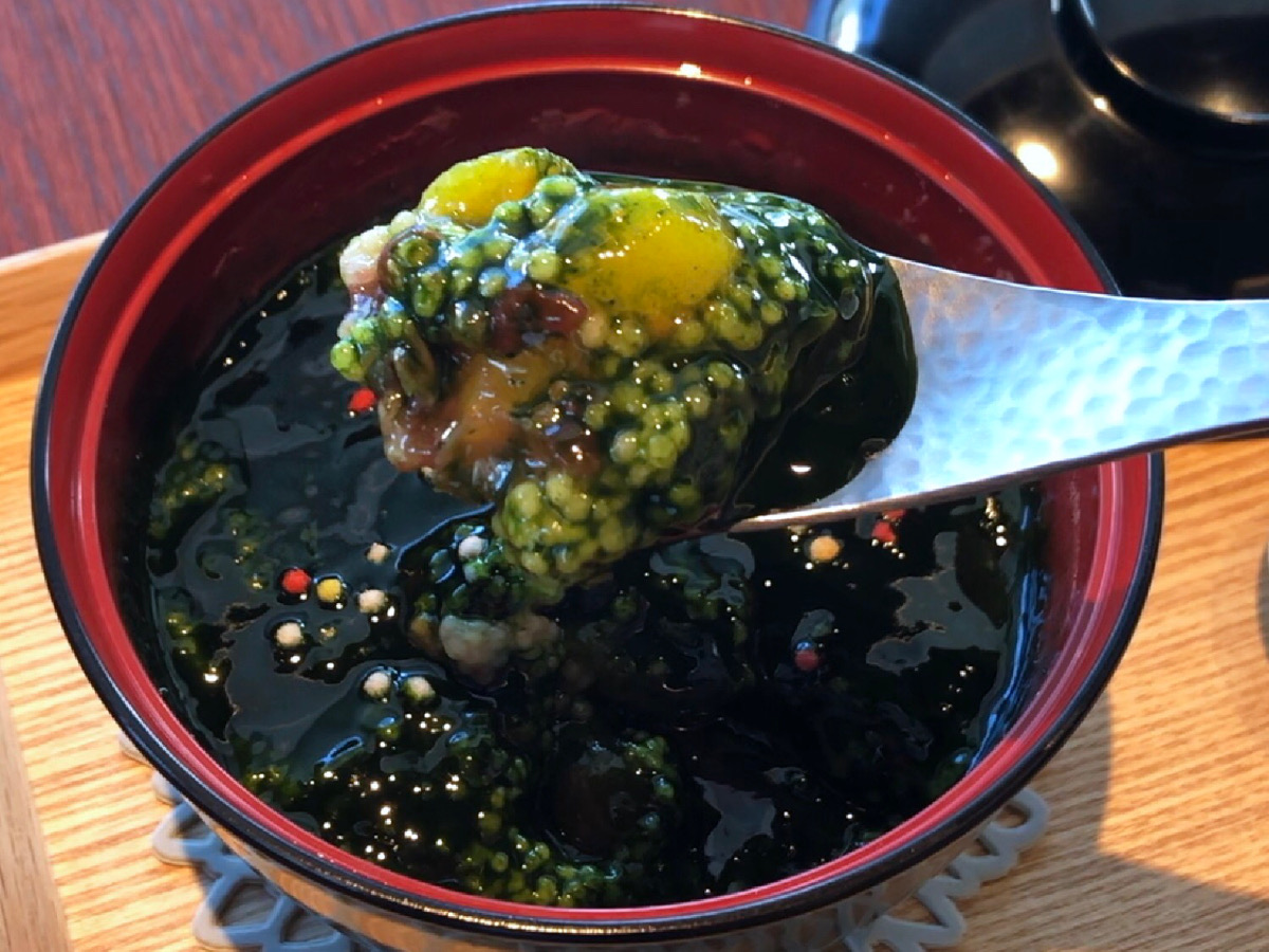 抹茶の色が濃くて驚きますが、お茶の香りと出汁の風味がほどよく合わさり、いくらと鮭の味をキリッと引き立ててくれます。