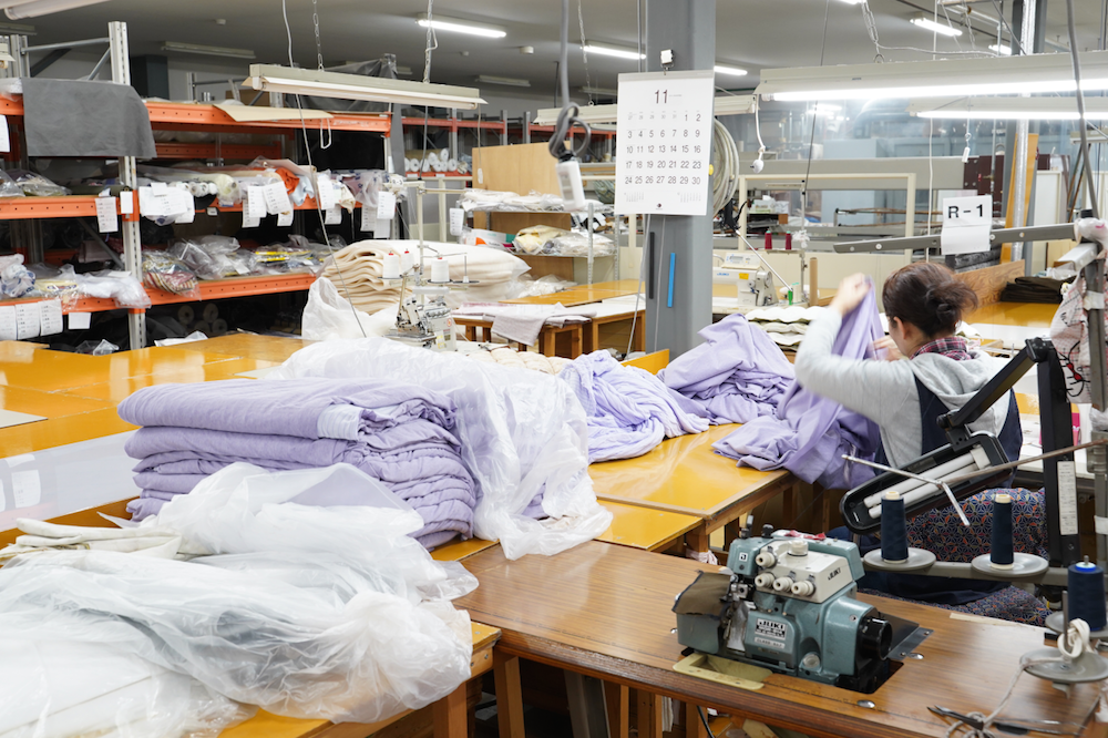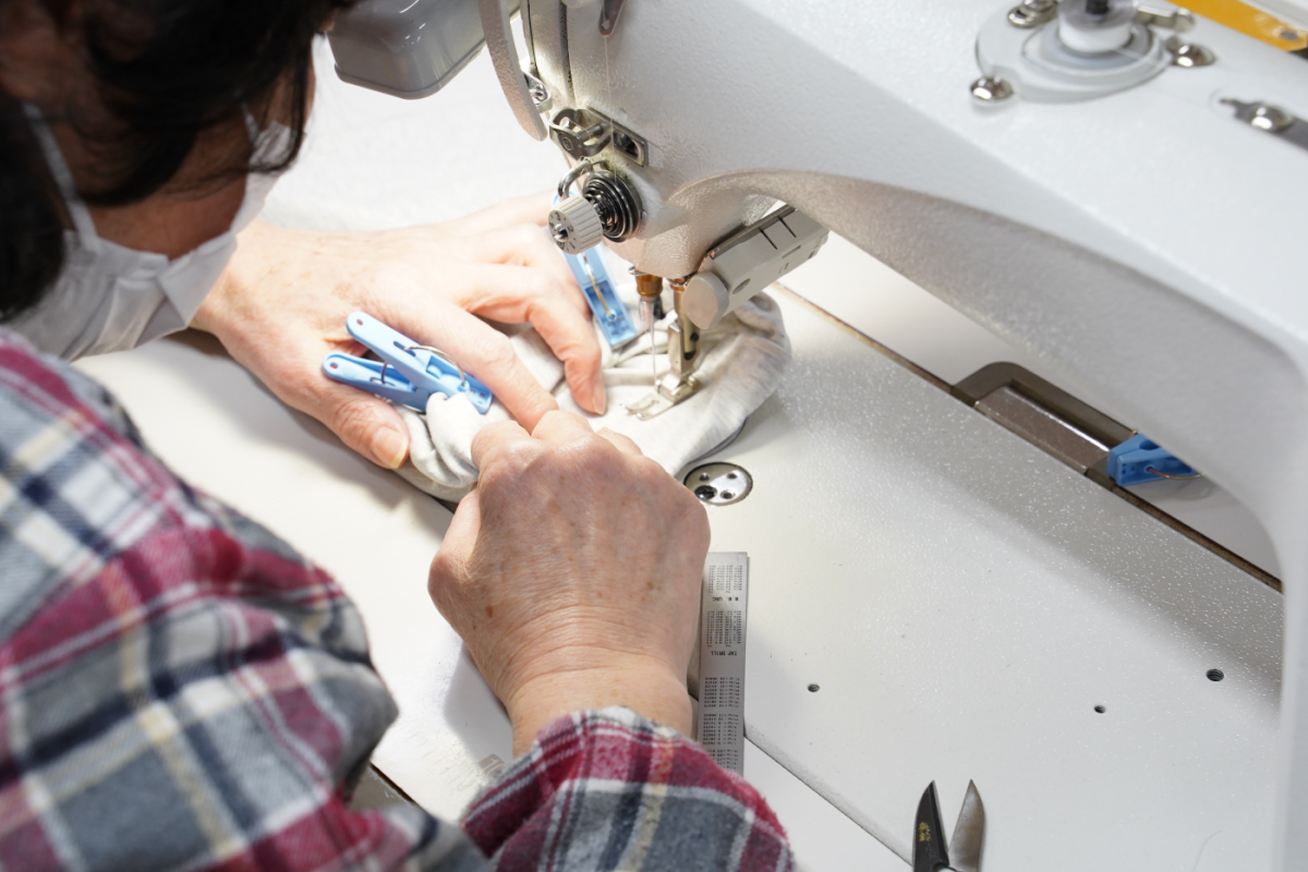 工業用ミシンでひとつずつ丁寧に縫いあげる「ユルックス」