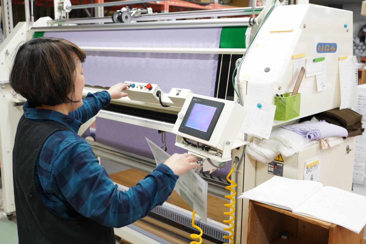 「ユルックス」専用に入荷されたロール状の生地は、機械を使って裁断します。