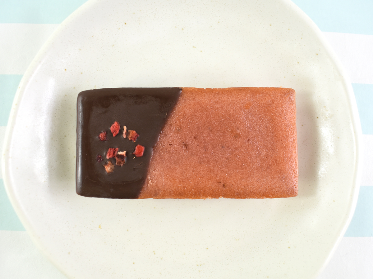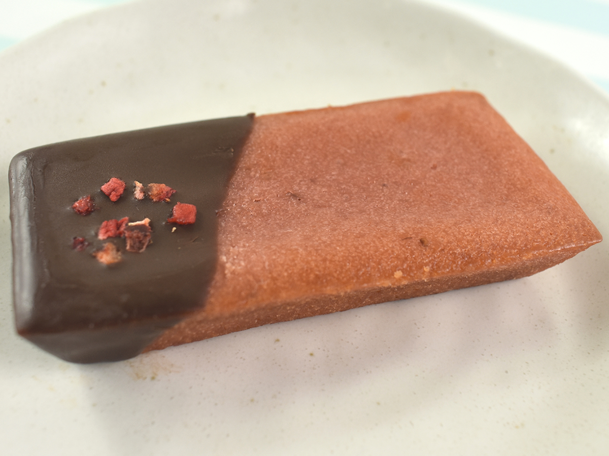 まずはチョコレートがかかっていない部分からぱくり。思っていた以上にふんわりとした仕上がりで、いちごジャムとピューレの“粒感”がしっかり残っています。後から甘酸っぱい風味が口の中へ広がって、生地の甘みと見事にマッチ。表面は茶色いカラーリングですが、生地の中は華やかなピンク色でした。焼き菓子特有の“パサつき”を感じることもなく、とても上品なテイストです。