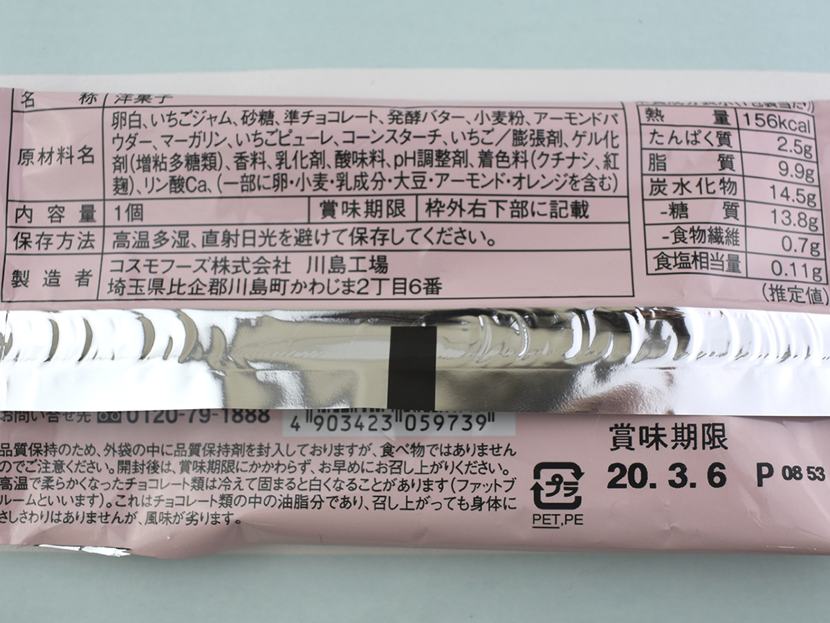 チョコレートの部分を口に含んだところ、カカオの風味がプラスされてマイルドな味わいに。ストロベリーピースも相まって、いちごの香りがさらに引き立ちます。なお、1包装当たりのカロリーは156Kcalほど。保存する際はチョコレートが溶けないよう、冷蔵庫に入れてください。
