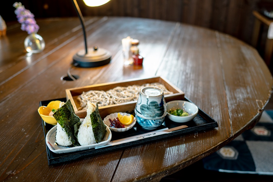 初大分の一食目は、山あいの手打ちそばの店へ。鶏めしを使った大分らしいオムライスも気になりましたが、迷いに迷って、とり天むすざる(1200円)をオーダー。冷たいそばと、大分名物「とり天」がニョキッと突き出たキュートなおむすびのセットです。近くに湧く清水を使って手打ちされるそばは香りも喉ごしも良好で、ツルツルと無限に食べられそう。