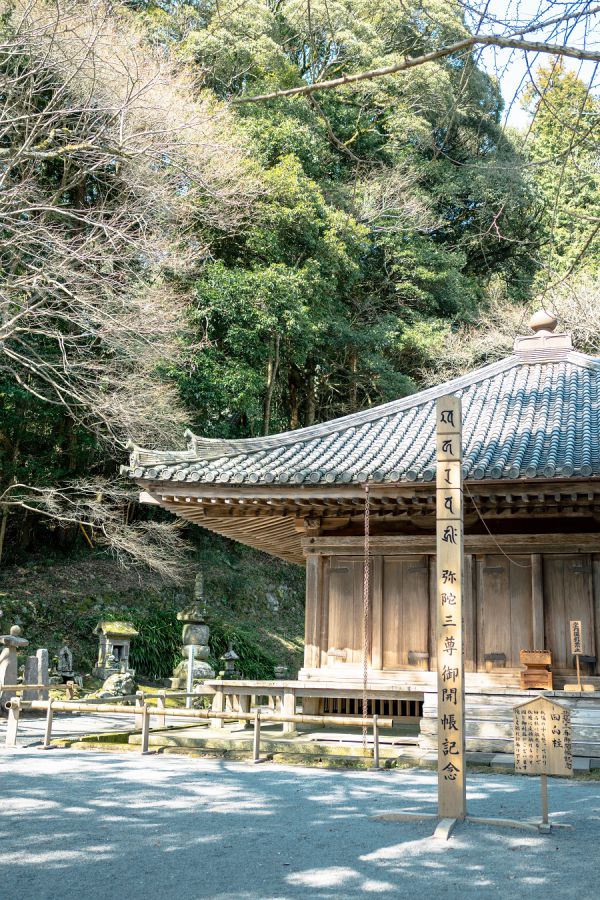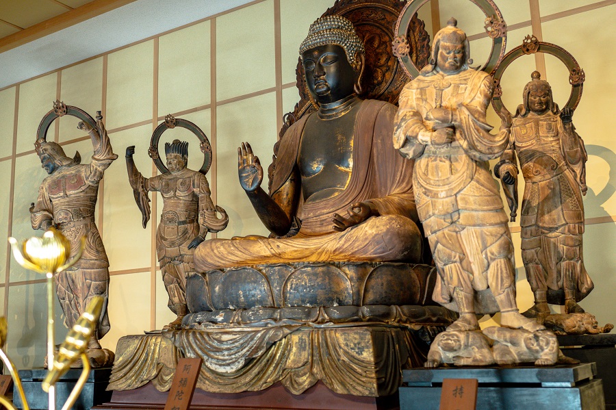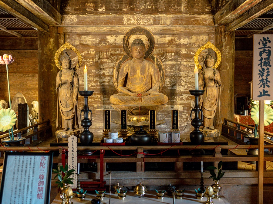 中にはご本尊である阿弥陀如来の坐像が安置されています。さらに、2019年から2年間の予定で行われている本堂の解体修理の間は、観世音と勢至の両菩薩も阿弥陀堂に移されているため、特別に阿弥陀三尊像が揃って拝観できるようになっています。こんな貴重なタイミングでうかがえるとは、なんと、ありがたや。雨天時は壁画保護のため拝観できないそうなので、ぜひ、晴れた日に。