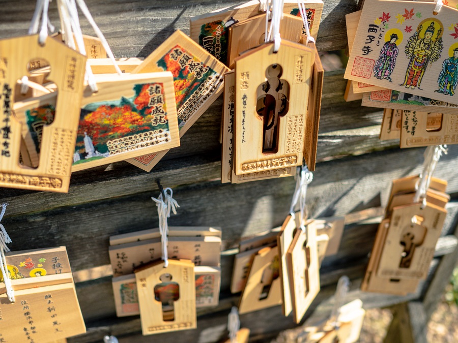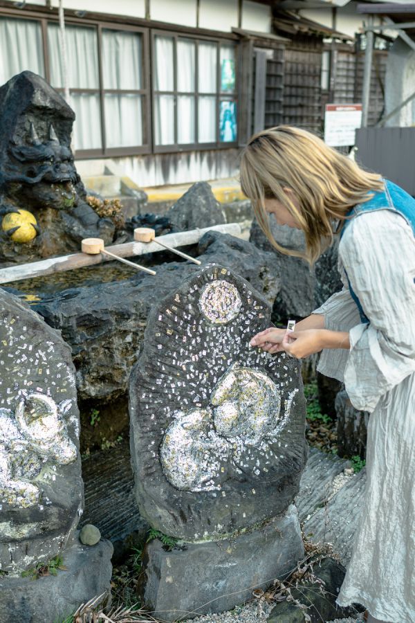 磨崖仏の入り口にある胎蔵寺では、阿弥陀如来像や十二支像に金色の護符シールを貼って開運祈願もできますよ。