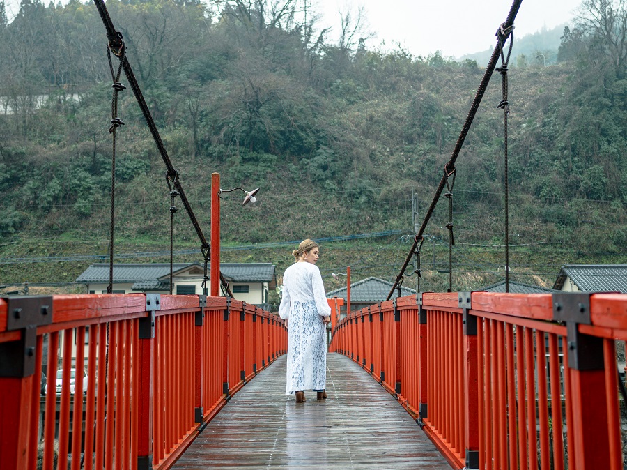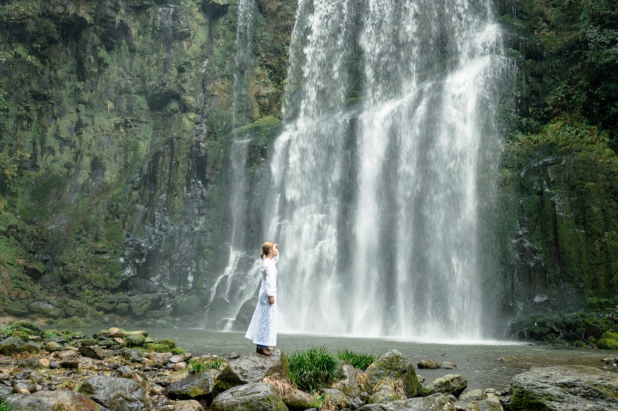 さて、始まりました二日目。まずは山の車窓を楽しみながら、別府・湯布院と並ぶ大分三大温泉のひとつ「天ヶ瀬温泉」エリアへと向かいます。到着後は、落差25mの「桜滝」にてしばしリフレッシュ。