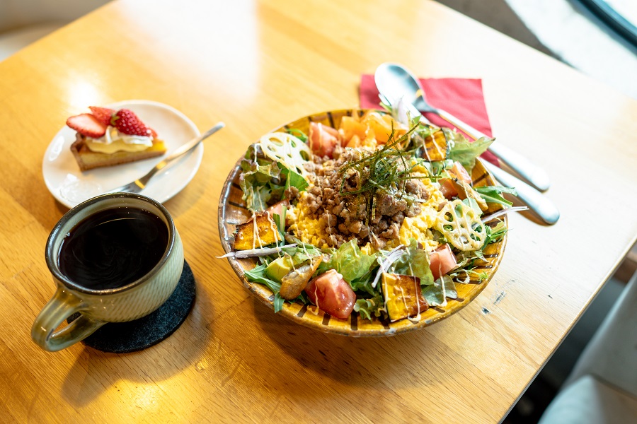 ランチは、特徴のある団子壁がキュートな「麦屋カフェ」で。日田っ子ライス(単品780円、セット1000円) は、タコライス風のオリジナルメニューです。柚子胡椒が効いたチリソース「ユズリッチ」が隠し味に。