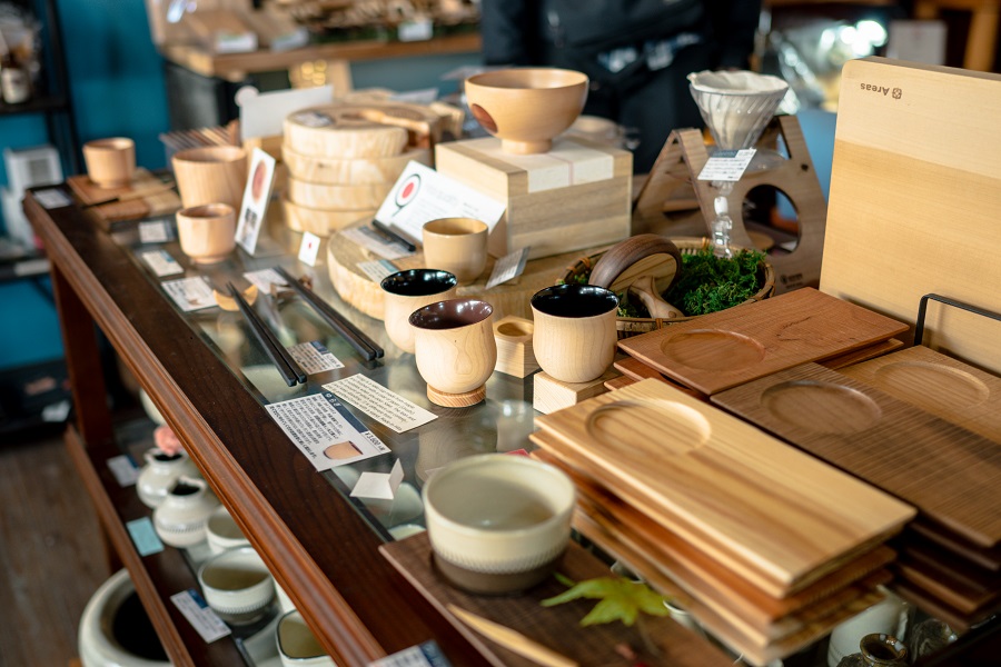 旅もそろそろ終盤。日田ならではのお土産を求め、地域のモノづくりを応援するセレクトショップ「Life design shop Areas」へ。こちらでは、日田杉など地域の資源を活用した雑貨、アクセサリー、文具などのアイテムを取り扱っているそう。雑貨店というよりは日田のおしゃれなものが集う工芸館といった雰囲気が心地よく、一つひとつのアイテムに、物欲全開で見入ってしまいました。