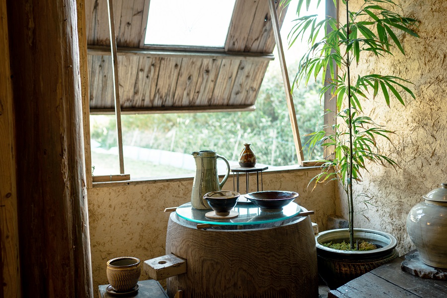 豆田町を楽しんだ後は、江戸時代中期から続く素朴な民陶・小鹿田焼のふるさとを訪ねて、一路、北を目指します。 まずは、築158年を数える茅葺き屋根の自宅を改装してオープンしたという、小鹿田焼の素敵なセレクトショップ「日田鹿鳴庵」をのぞき見。
