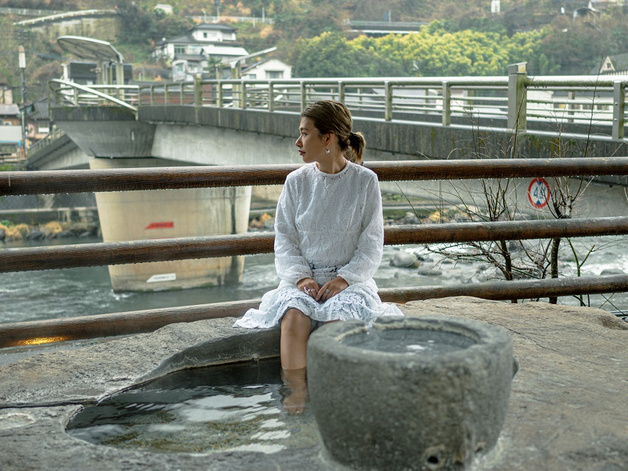 玖珠川をはさんで両岸に、15軒ほどの温泉宿や小さな饅頭屋さんなどが立ち並ぶ天ヶ瀬温泉。川沿いに点在する素朴な共同露天風呂は必見です。絶景のどまん中で入浴できる開放的(すぎる?)温泉もありました! もちろん周囲から丸見えですが…水着OKの温泉もあるそうなので、ご安心を。