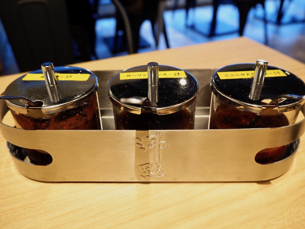 テーブルには、豆板醤、ガーリックソース、ニンニク入り辣油が用意されています。3つを調合すれば、どのお鍋にも合う最高のタレが完成。