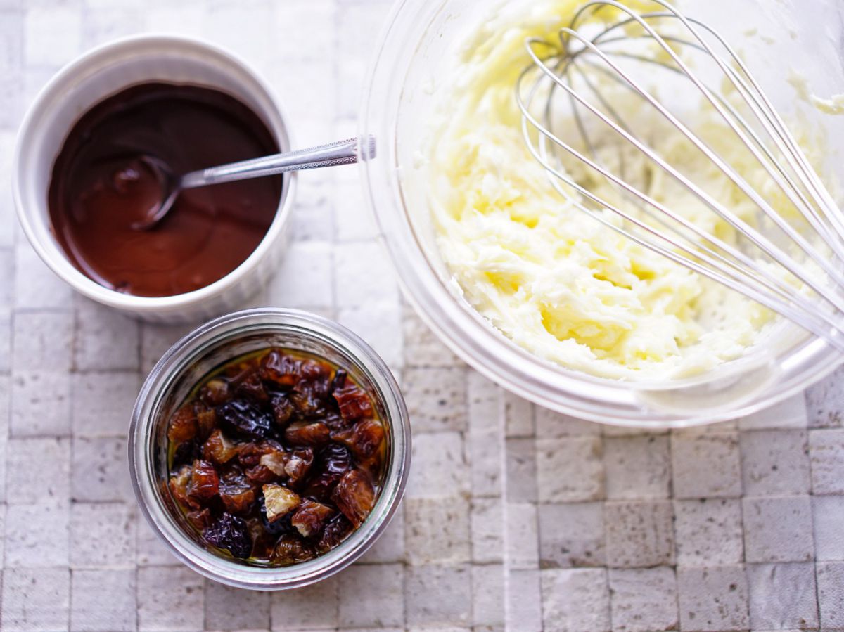 湯煎で溶かしたチョコレートとラム酒を切ったレーズンを加えてさらによく混ぜます。
