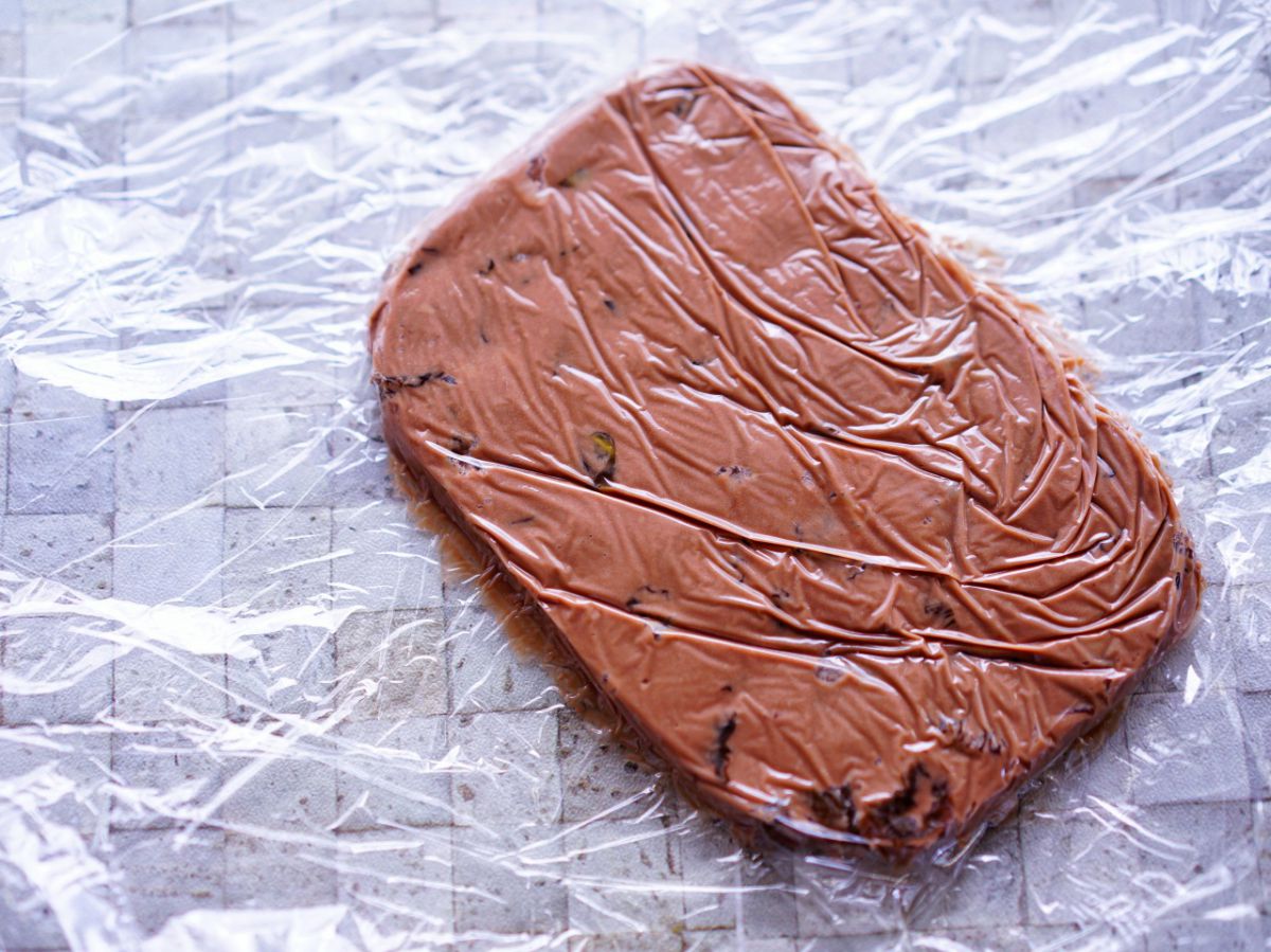 クリームをラップで挟み、麺棒で1cmの厚さに伸ばします。冷蔵庫で30分ほど冷やし固めます。