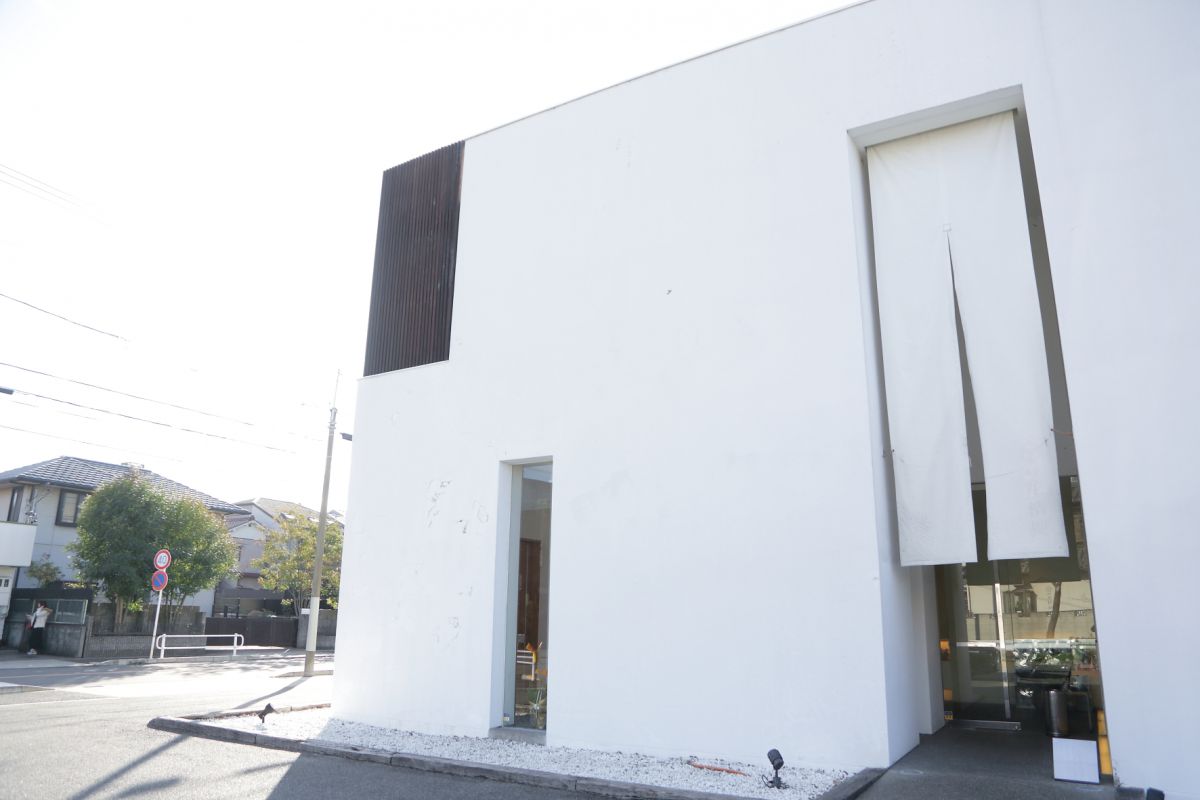 「花桔梗」は名古屋市瑞穂区にある和菓子店。ホワイトキューブの外観と白いのれんが目印です。
