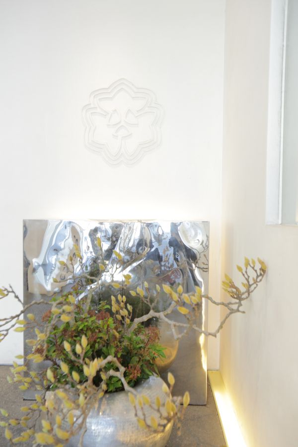 水が流れるオブジェと季節の花がお出迎え。和菓子店の印象をくつがえすモダンなデザインにワクワク!