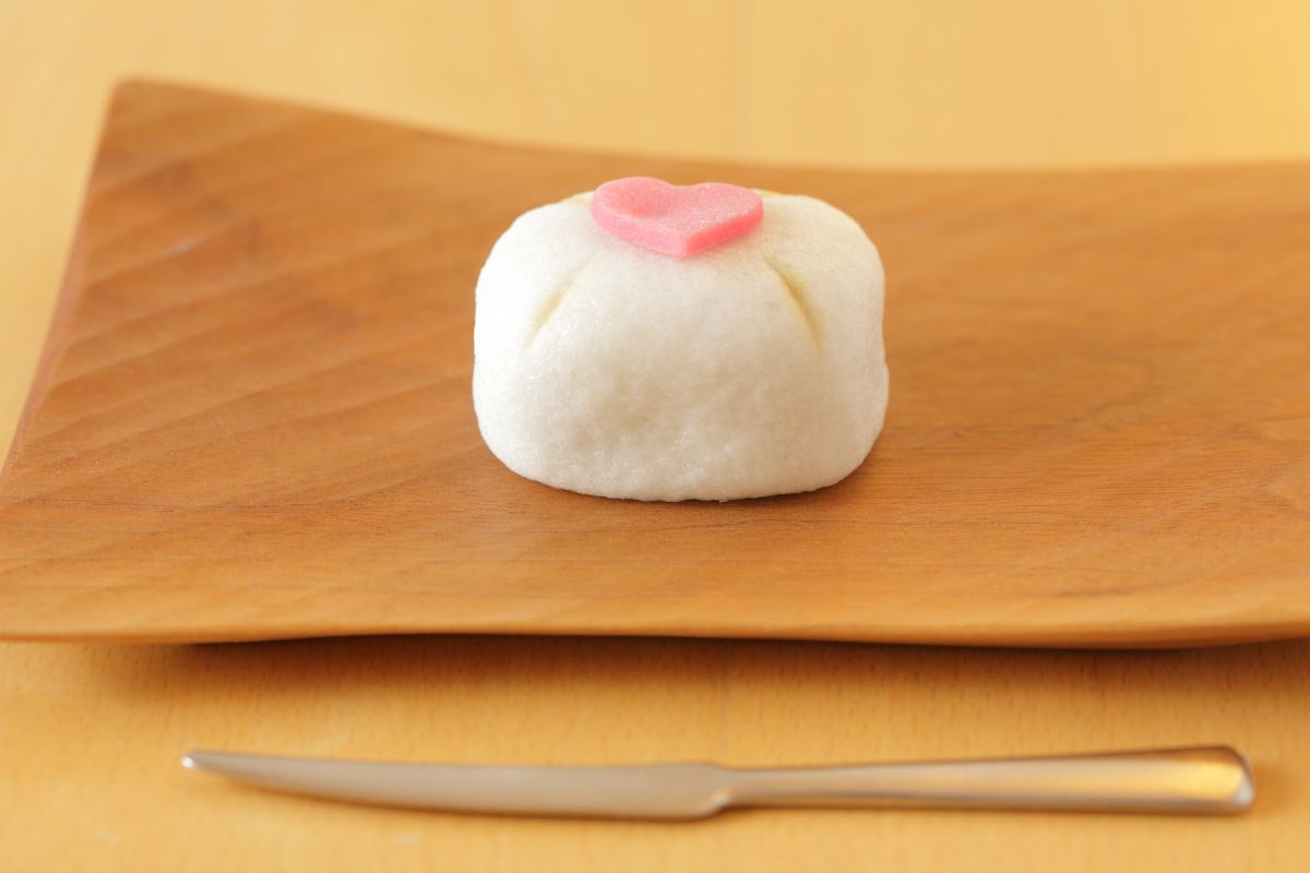 伝統の「じょうよ饅頭」も、花桔梗にかかればこんなにラブリーに。ラブレターデザインは女性の職人発案です。