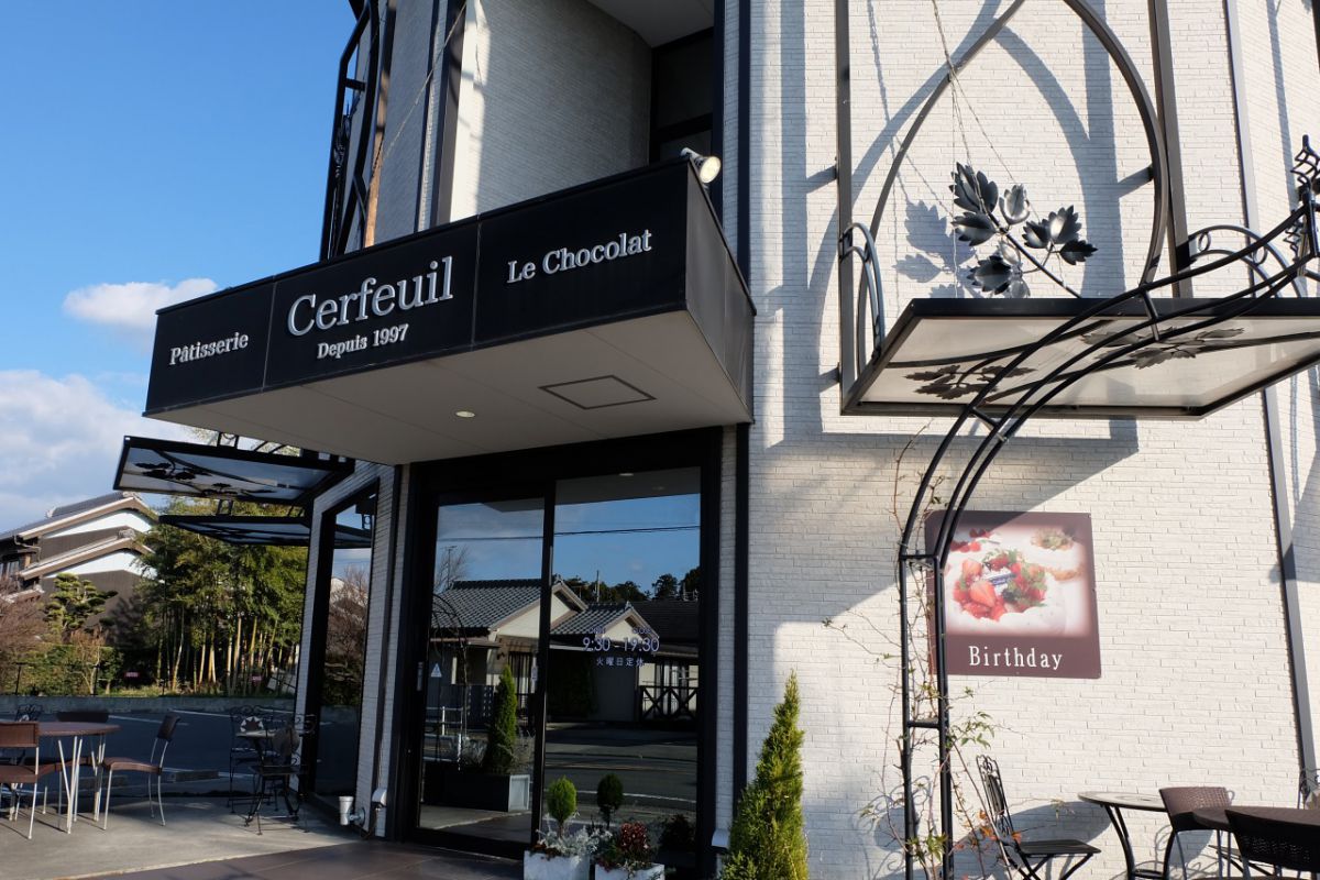 東名高速道路豊川ICより、車で約10分。白と黒のスタイリッシュな建物が目を引くのが、パティスリー「セルフィーユ」です。ケーキとチョコレートを楽しむことができ、さまざまな種類のスイーツを揃えています。