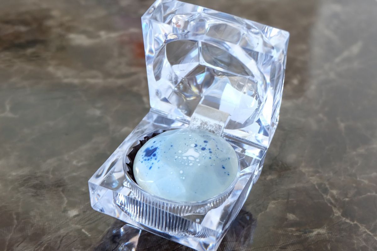 こちらは3月のアクアマリンをイメージ。キリュシュのジュレと塩ガナッシュを組み合わせて作っています。
