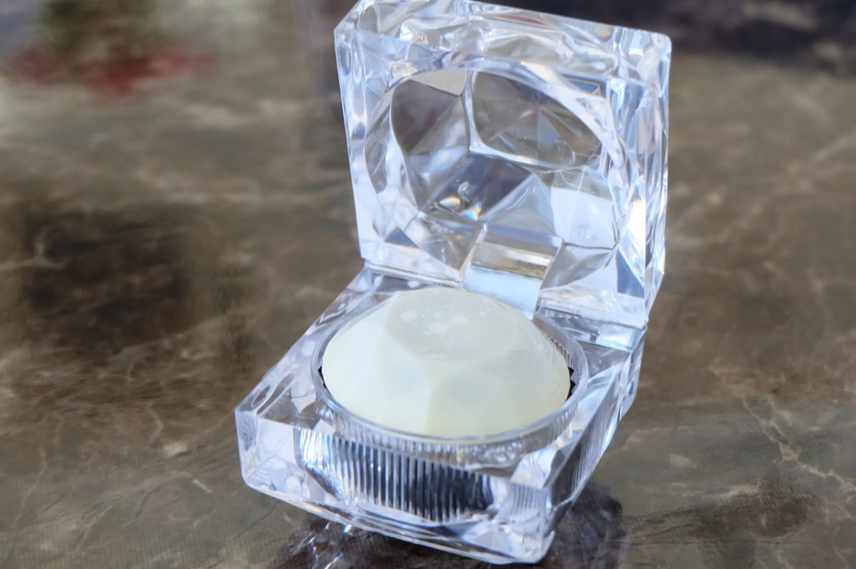 4月の「誕生石ショコラ」はダイヤモンドをイメージ。真っ白に輝くダイヤモンドは、シャンパンのジュレとガナッシュで作っています。