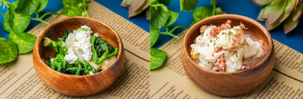 前菜には、爽やかな酸味が広がるカッテージチーズと瑞々しい菜の花の和え物「菜の花とカリフラワーのカッテージチーズ和え」(左)や、燻製の香りが楽しめる「スモークチーズとベーコンの燻製ポテトサラダ」を。