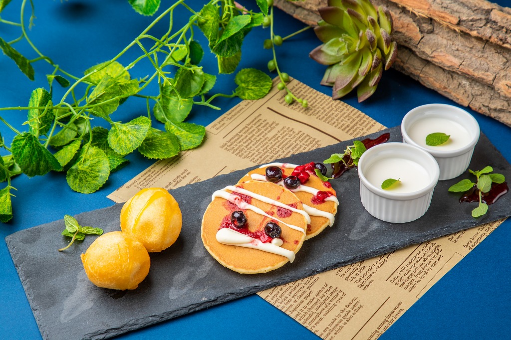 たらふく食べてもデザートは別腹です。クリームチーズの風味を感じるカリっと揚がった「クリームチーズドーナッツ」(左)や、イチゴとブルーベリー、ラズベリーなど酸味のあるソースと特製チーズがコラボした「パンケーキベリークリームチーズソース」(中)、酸味の効いたさっぱりとした味わいの「レアチーズケーキ」(右)もどうぞ。