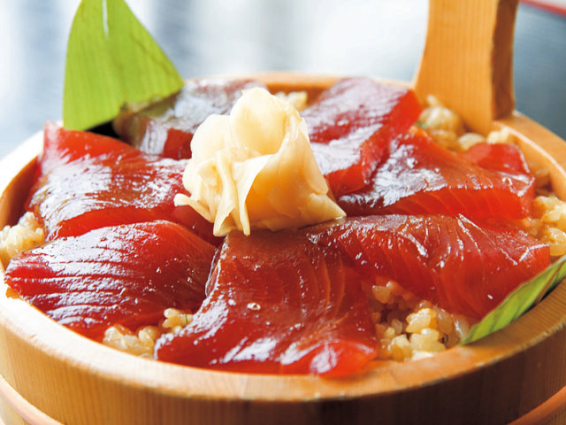お昼は「すし久」で伊勢志摩の田舎料理をいただきましょう。純日本風の建物と広々とした板の間は、まるで旅籠のような雰囲気。秘伝の醤油に漬けたカツオの切り身を酢飯にのせた、この地方の昔ながらのお料理「てこね寿し」がイチ押しメニューです。地元のブランド米「御絲産コシヒカリ」を使っているのもポイント。そのほか、ひつまぶしや季節料理も充実していて伊勢志摩の味を堪能できます。