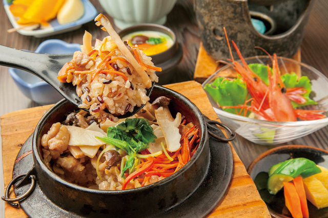 公園に隣接し、豊かな自然の中に佇む釜めし専門店。ここでは、オーダーを受けてから炊き上げるのが特徴で、できたてアツアツをいただくことができます。山菜たっぷりの釜めしや、鮎が丸ごと入った釜めしなどがあり、どれも絶品。隠れ人気メニューの鳥の照り焼きもおすすめです。