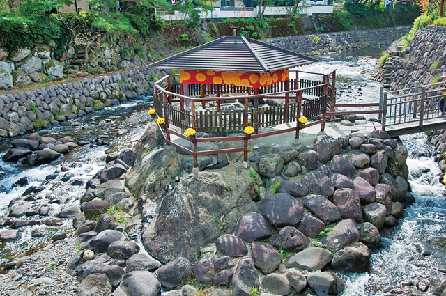 弘法大師が岩を砕いて湧出させたという伝説がある修善寺温泉。温泉街を流れる川の河原にある「独鈷の湯」は、修善寺温泉発祥の地で、伊豆最古の温泉とされています。現在はこの湯に入ることはできないけれど、すぐそばに無料の足湯・河原湯があるので、川のせせらぎを聞きながらのんびり足湯を楽しみましょう。