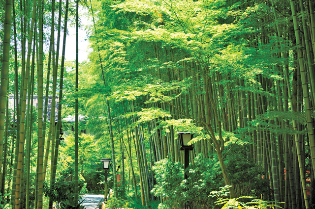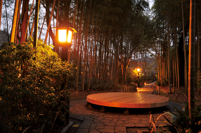 「竹林の小径」は、温泉街を流れる桂川沿いに造られた、全長約300mの石畳の散歩道。小径を覆うほどに竹が生い茂り、京都・嵐山の竹の小径に似た神秘的な雰囲気を醸し出しています。日中、青々とした竹を眺めながら歩くのはもちろん、夕方以降はライトアップされたムードたっぷりの風景を楽しむことができます。小径の中間地点に設置されている竹の丸形ベンチに座り、心に染みる静けさを味わって。