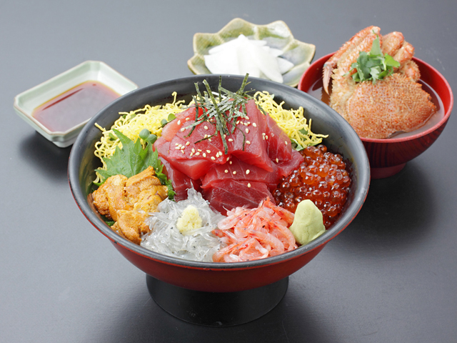 沼津を訪れたら、必ず食べたいのが海鮮料理。「魚河岸丸天」では、駿河湾で水揚げされる多彩な魚介類を中心にした、沼津の味を味わうことができます。おすすめは、桜エビや白魚、自家製イクラをのせた魚河岸わいわい丼や、8種類のネタが味わえる魚河岸丸天丼などの海鮮丼。さらに、インパクト大の名物料理・海鮮かき揚げ丼は、ぜひ食べてみてほしい一品です。メニュー選びはもちろん、どこから食べ始めれば良いか悩むボリュームたっぷりの料理は、見ているだけでしあわせ気分になれますよ。
