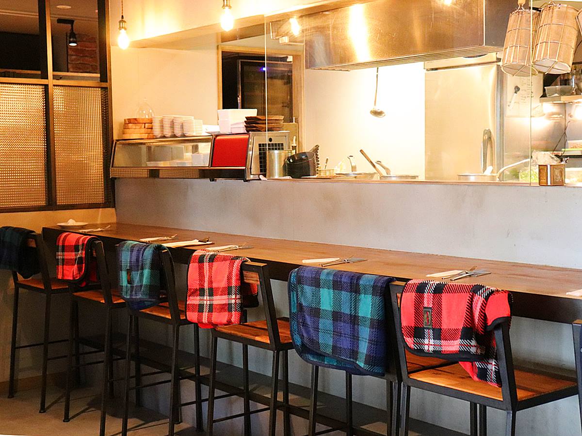 店内には複数人で座れるテーブル席のほかに、ライブ感を感じられるオープンキッチンのカウンター席も。