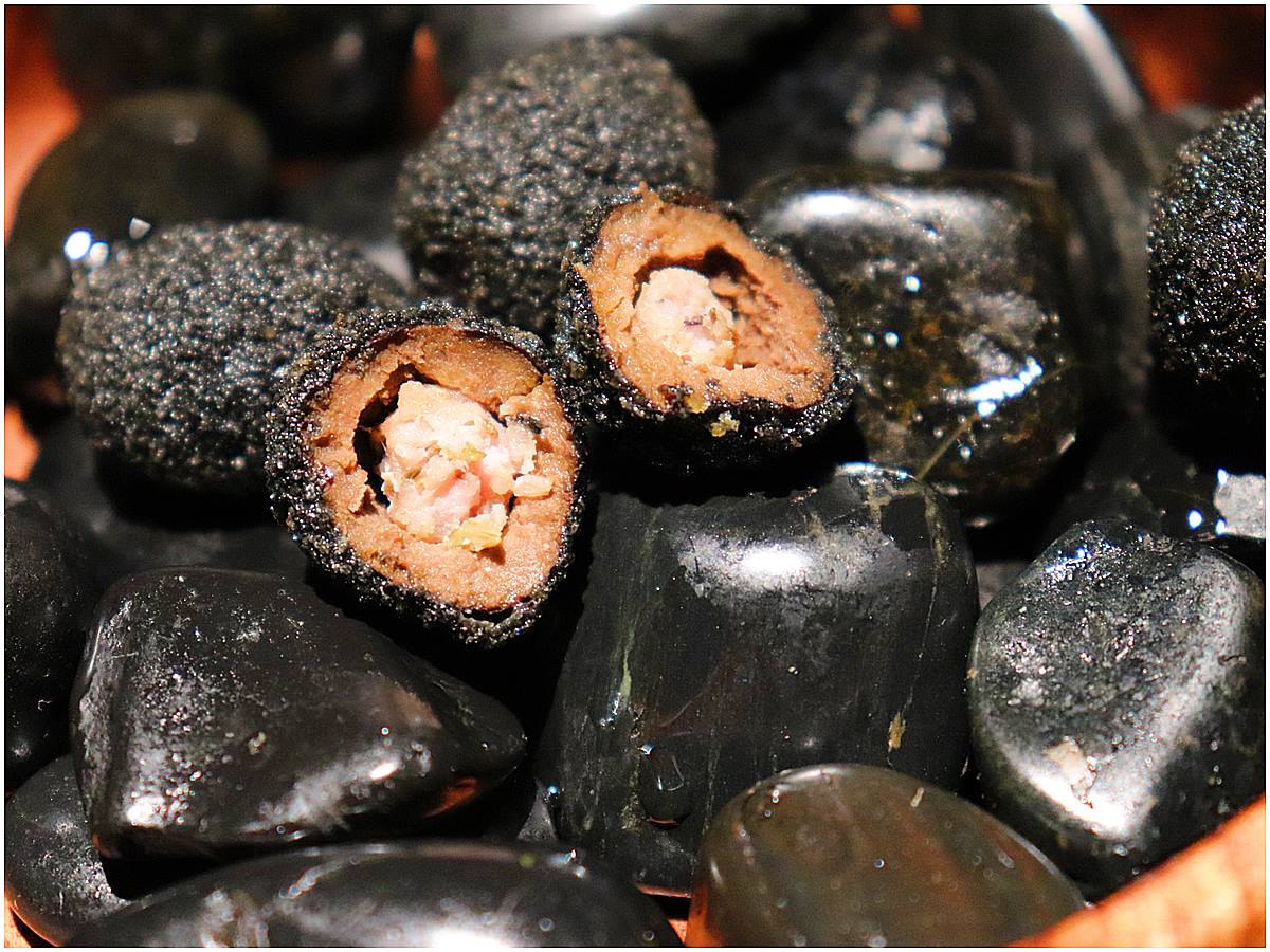 オリーブの周りには竹炭、そして中にはサルシッチャが。オリーブの果実感とお肉のジューシーさは、お酒にぴったり。